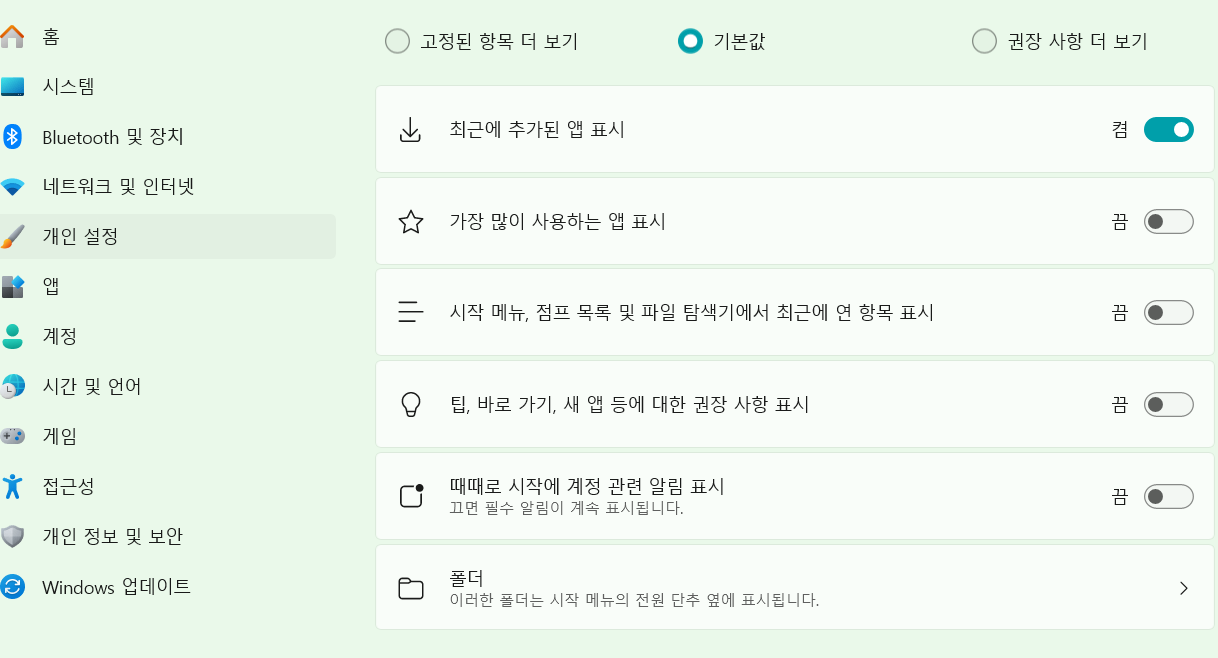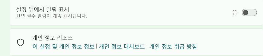 - 알림 : '시스템' 메뉴로 가서 '알림 및 작업'을 클릭한 후, '앱 알림'을 끕니다.