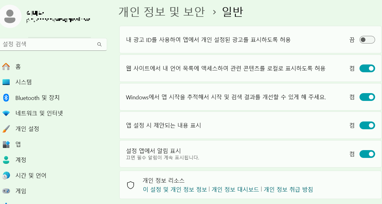 - 일반 : '일반' 탭에서 '앱에서 광고 ID를 사용하여 광고를 개인화할 수 있습니다.' 옵션을 끕니다.
