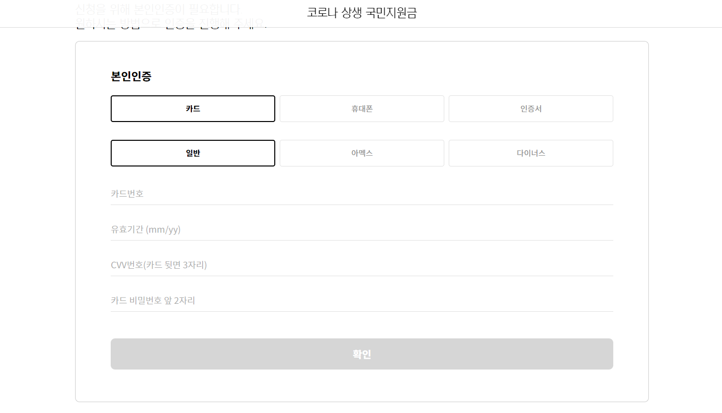 카드번호로 인증, 휴대폰 번호로 인증, 인증서 인증 3가지 방법이 있는데요. 저는 엄마에게 미리 엄마 명의로 된 신용카드 앞뒷면 사진을 미리 받아 놓았습니다. 대리 신청은 신용카드 인증이 간편한 것 같아요.